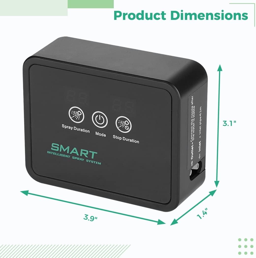 Color: black Material: Plastic Size: 3.1"x3.9"x1.4" Package Includes: 1pc * Smart Timer 1pc * 5V USB Charger 2pcs * Nozzles 1pc * 16Ft Pipe 1pc * Pipe Cutter 1pc * Suction Filter 1pc * T-connector 1pc * L-connector 5pcs * R-clamps 2pcs * Pipe Plugs 5pcs * Cable Ties 1pc * Manual Note: - Please refer to the measurement. Tiny measuring error is allowable in normal range. - There might be a little color difference due to the monitor, camera or other factors, please refer to the physical item.
