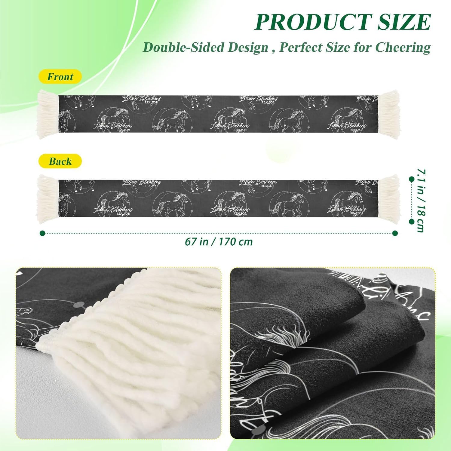 Show your team spirit and stay comfortable with our versatile sports fan scarf. This long scarf isn't just for display; it's designed for active fans who live for the energy of the game.Made from 100% soft polyester with a brushed finish, it feels gentle on your skin, Ideal for tying around your neck or waving above your head. When the action heats up, use it as a handy sweat wipe. The fabric absorbs moisture and dries quickly, so you can focus on the game.Featuring a generous 70-inch length and classic fringe ends, it offers a bold canvas for your team colors and slogans. The soccer scarf print is bright and durable, maintaining its look through many washes. A gift for any sports enthusiast in your life for birthdays or game day celebrations.Customizable designs are , making it ideal for fan clubs, tournament events, or cheering squads outside the stadium. Easy to care for with regular machine washing, this reliable accessory is ready for every season.